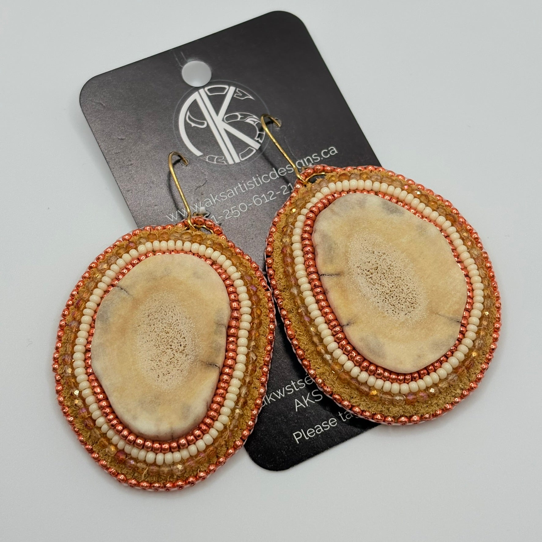 These moose antler earrings are beaded right onto hide with oranges, 1 cut cream and shiny multi-cut beads. Backed with more moose hide.