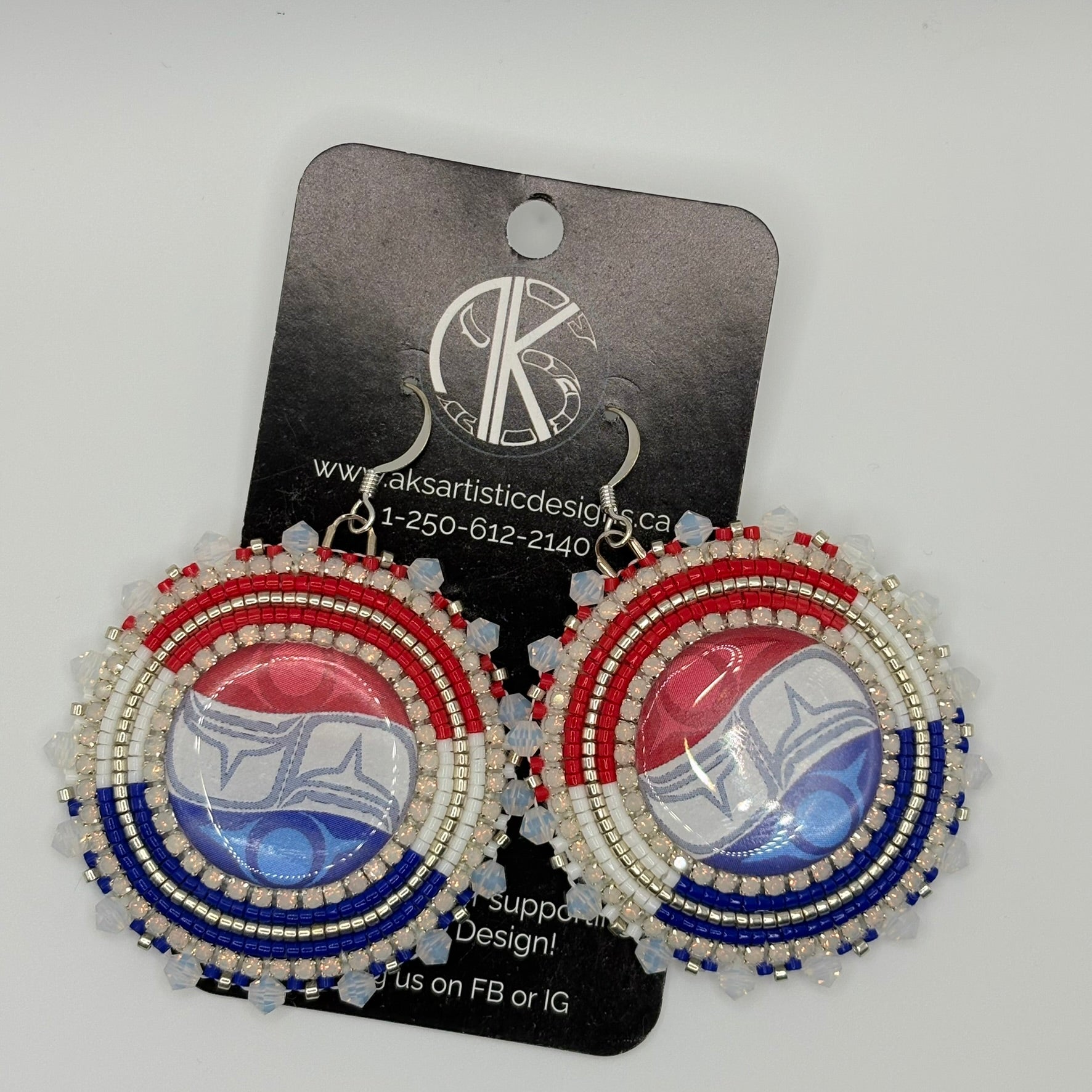 These earrings start with an Indigenous twist on the Pepsi logo (designed by me), then beaded with a shimmery opal rhinestone, silver, white, red and blue to accent the design. Perfect for the Pepsi loyalists out there!