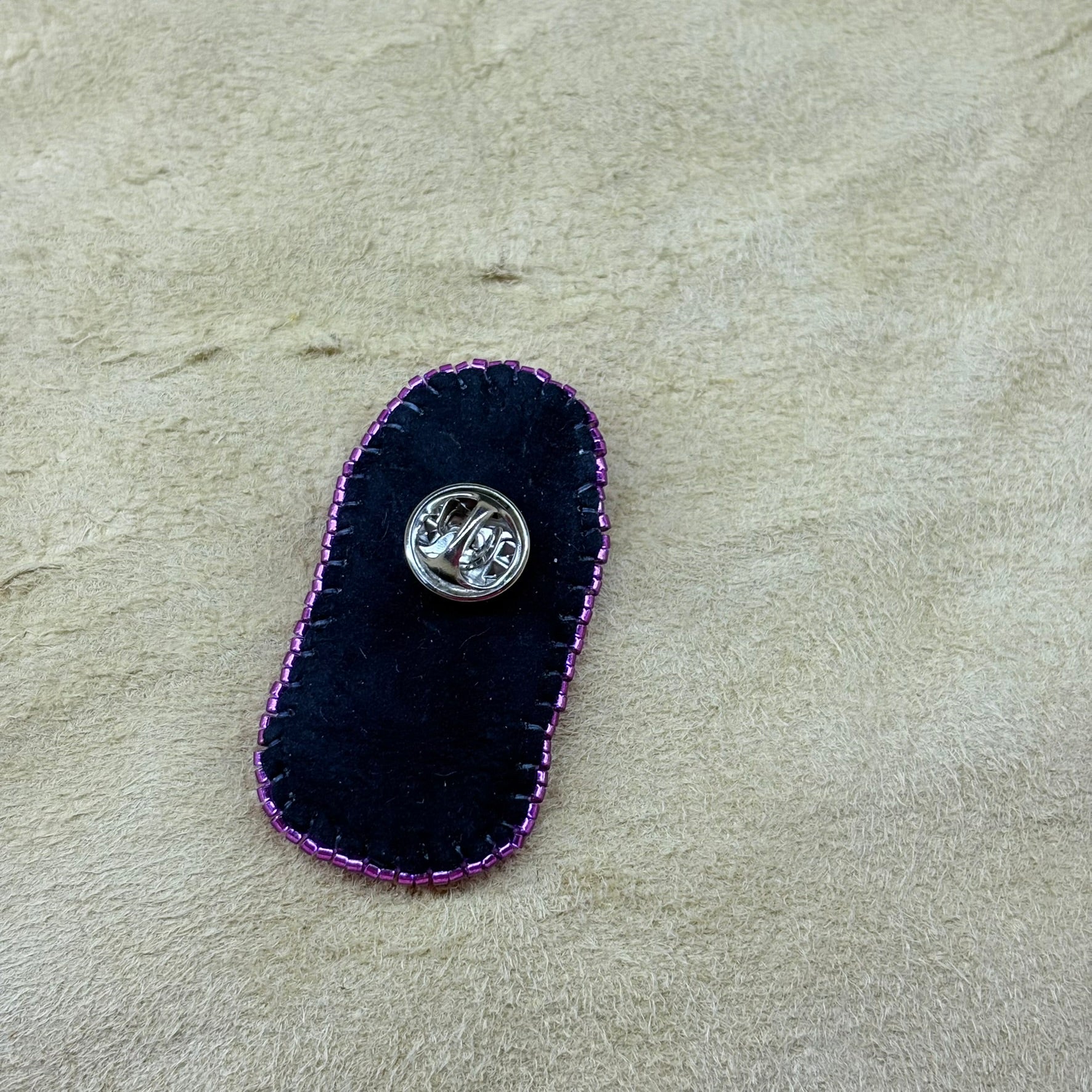Made with delica beads, this pin is 1" wide and 2" tall - backed with black deer hide and a butterfly pin.