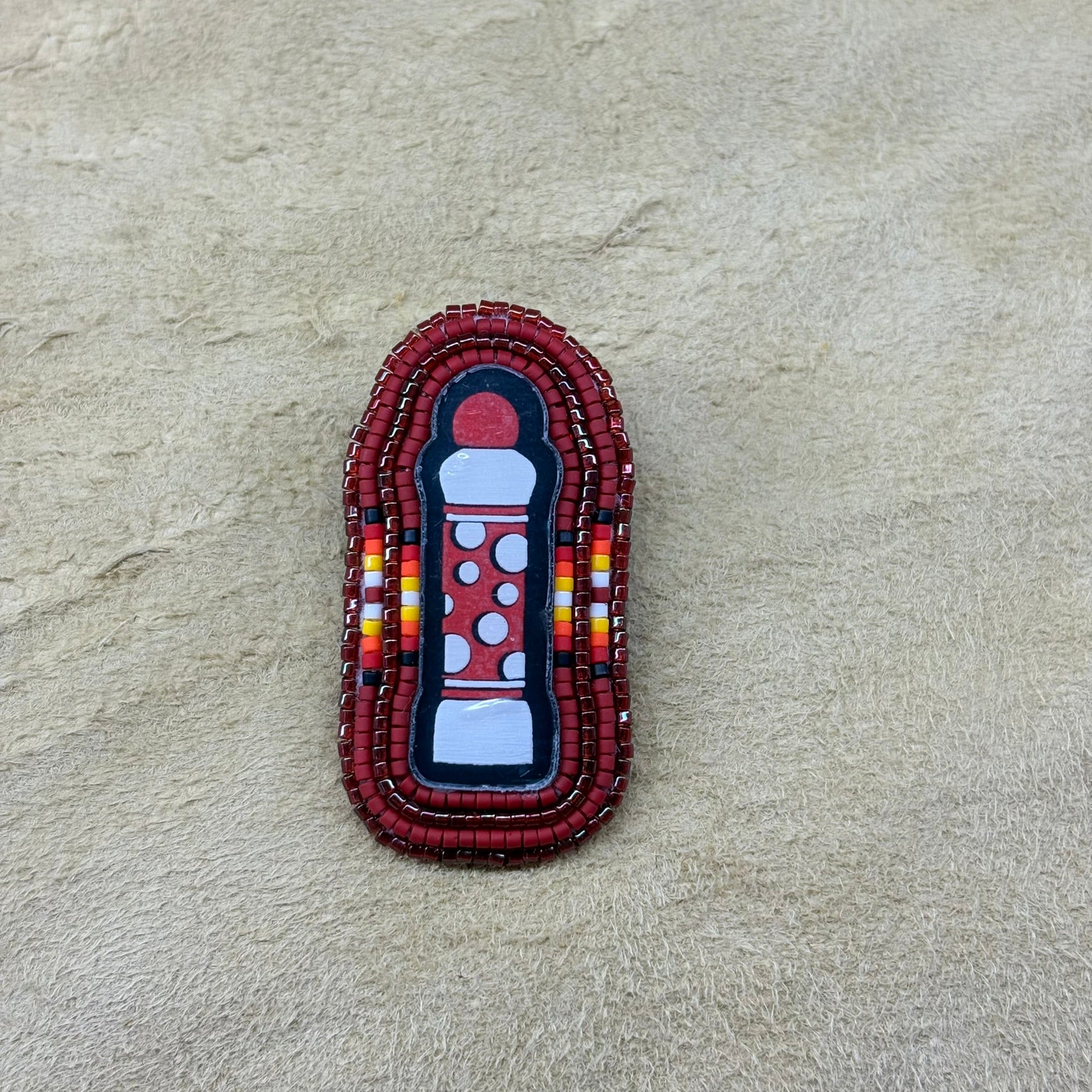 Made with delica beads, this pin is 1" wide and 2" tall - backed with black deer hide and a butterfly pin.