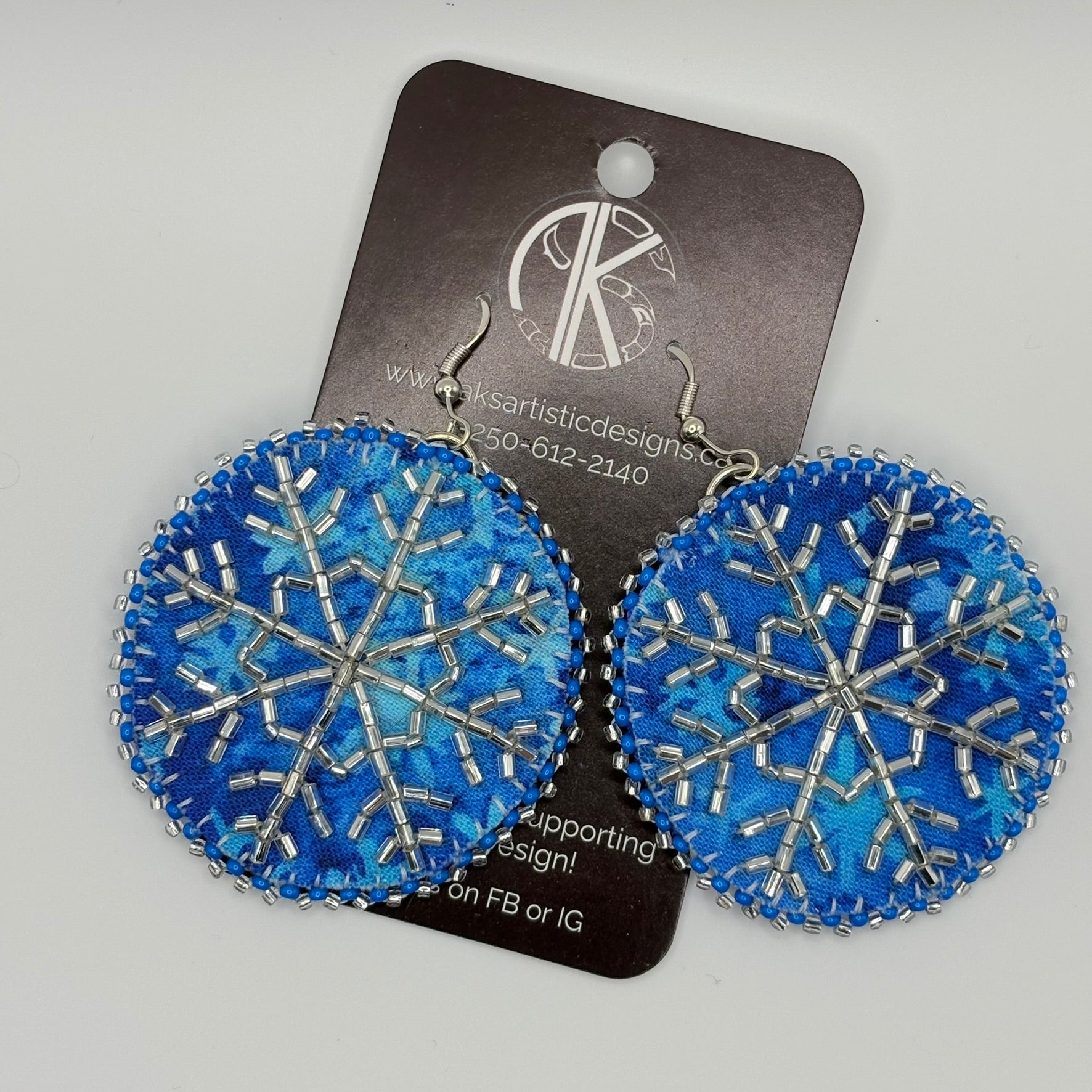 These earrings are beaded with size 1 bugles and 12/0 3-cut beads onto a snowflake fabric fused onto fabric stabilizer. They are backed with blue dyed deer hide, and edges with 11/0 beads and 12/0 3-cut's. They are roughly 2" wide.